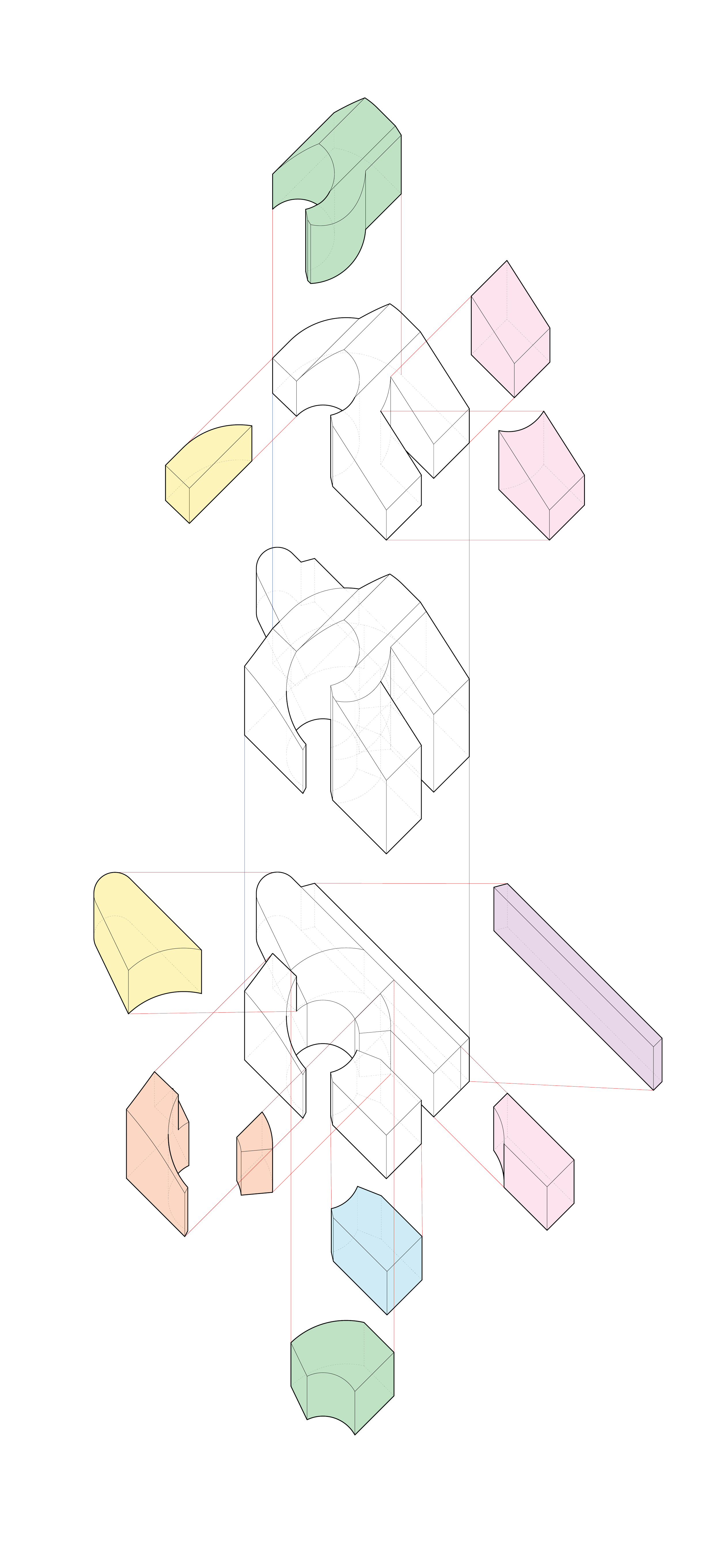 Four central columns derived from the vertices of a hexagonal bell tower anchor the building’s structure. Arches connect these points diagonally, while secondary and tertiary systems mediate between a diamond-shaped exterior and the hexagonal plan. This layering produces a vertically stitched geometry in which the ornament and structural are fully integrated.